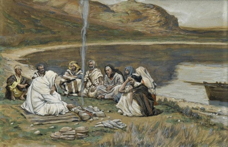 A kiedy zeszli na ląd, ujrzeli żarzące się na ziemi węgle, a na nich ułożoną rybę oraz chleb. Rzekł do nich Jezus: ”Przynieście jeszcze ryb, któreście teraz ułowili”. Poszedł Szymon Piotr i wyciągnął na brzeg sieć pełną wielkich ryb w liczbie stu pięćdziesięciu trzech. A pomimo tak wielkiej ilości sieć się nie rozerwała. Rzekł do nich Jezus: ”Chodźcie, posilcie się!”. Żaden z uczniów nie odważył się zadać Mu pytania: ”Kto Ty jesteś?”, bo wiedzieli, że to jest Pan. A Jezus przyszedł, wziął chleb i podał im, podobnie i rybę.